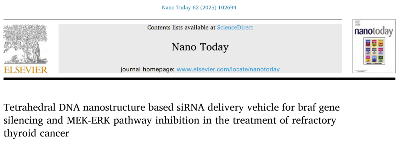 近期,四川省肿瘤医院李超教授团队张思诚博士后在JCR 一区Top期刊《Nano Today》(IF: 13.2)发表了题为“Tetrahedral DNA Nanostructurebased siRNA Delivery Vehicle for BRAF Gene Silencing and MEKERK Pathway Inhibition in the Treatment of Refractory Thyroid Cancer”的研究论文。该研究首次提出高效的TDNsiBraf递送体系,显著延长siRNA的半衰期并增强其对难治性甲状腺癌的抗肿瘤活性,为后续临床转化提供有前景的策略。