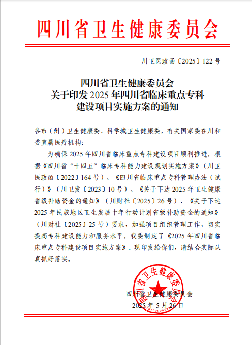 5月26日,四川省卫生健康委员会正式印发《2025年四川省临床重点专科建设项目实施方案》,医院病理科、麻醉科成功入选2025年省级临床重点专科建设项目。目前,医院已拥有国家级重点临床专科4个,省级临床重点专科8个,省医学重点学科(实验室)14个。